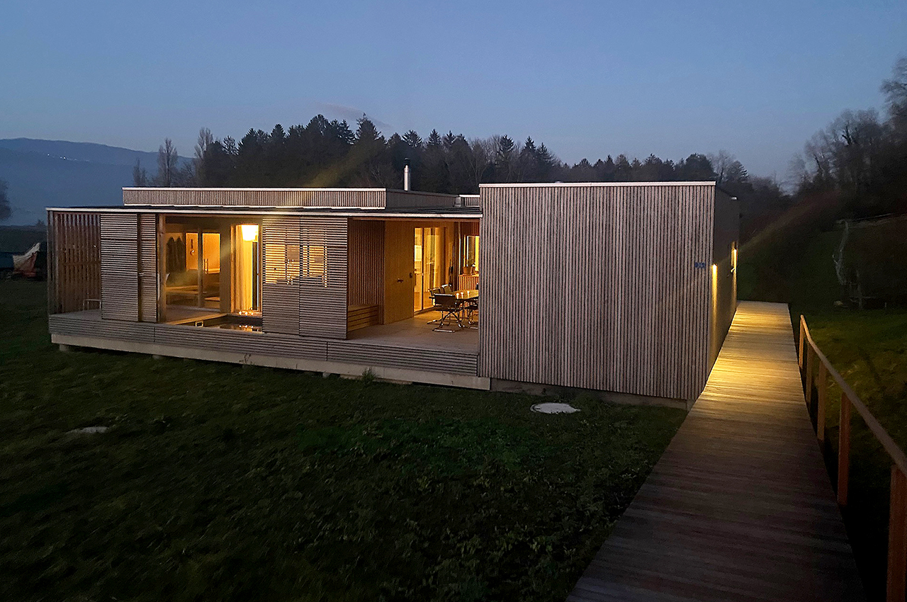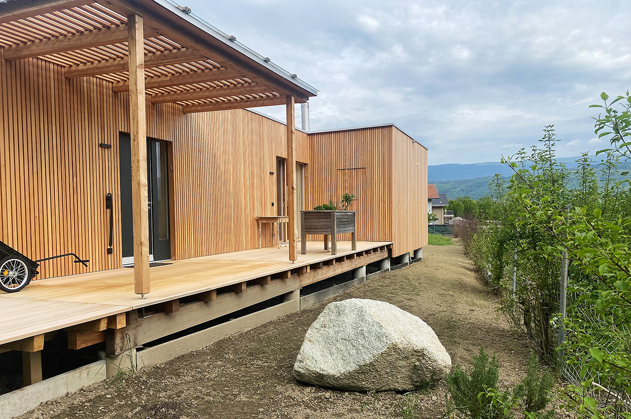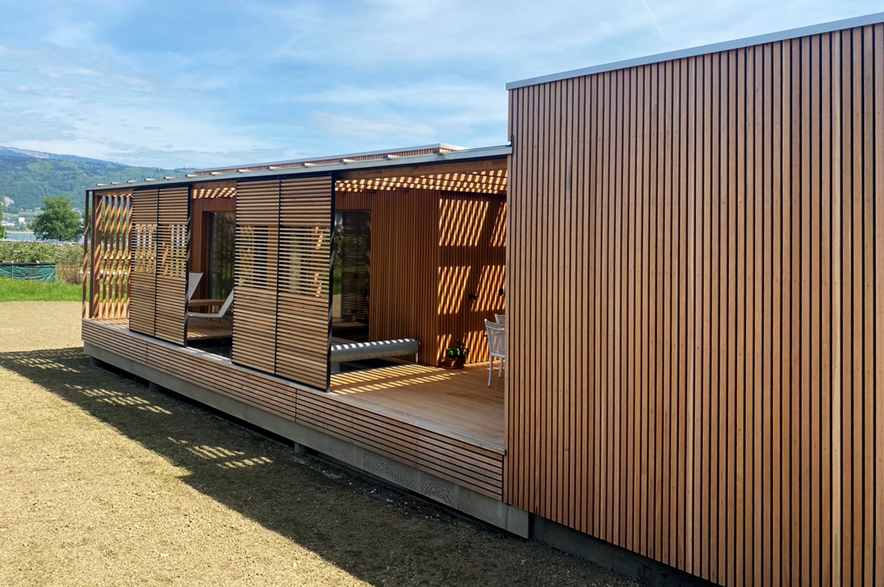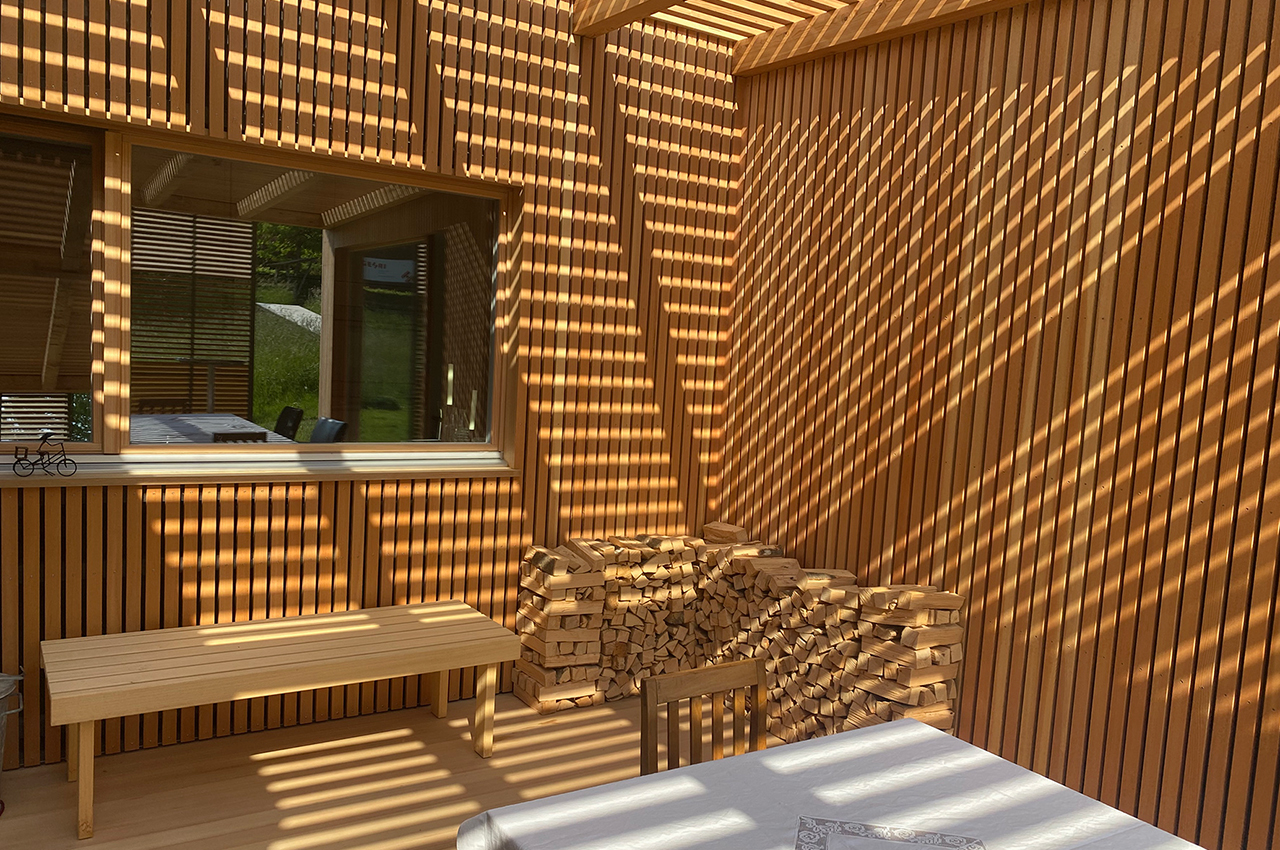 Die Kubusfassade besticht vor allem in der Präzision, welche durch die offene vertikale Holzschalung in ihrer Feinheit und den Farbnuancen zum Tragen kommt. In Kombination mit der transparenten Dachlattung gibt es während des Tagesablaufs wunderbare Muster, die diesem «Tiny House» eine subtile Inszenierung verleiht. Die Fenster sind jeweils präzise eingesetzt, um das Optimum an Offenheit für den Innenbereich zu gewährleisten. Jedes Detail dieses Hauses zeigt eine durchdachte Ästhetik.