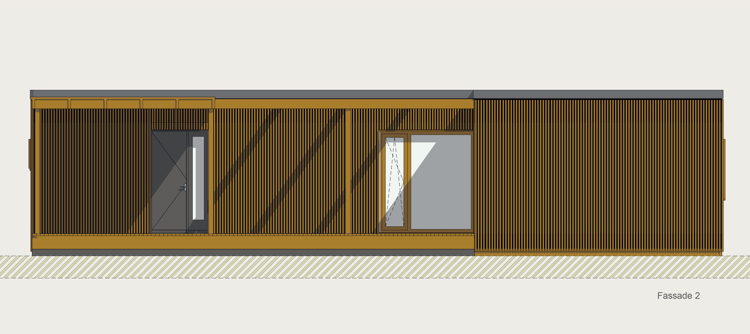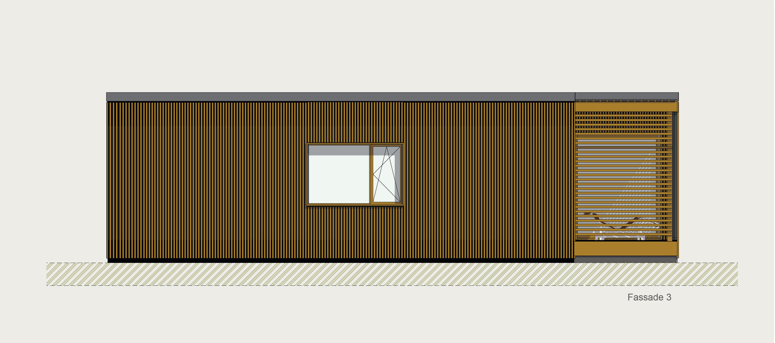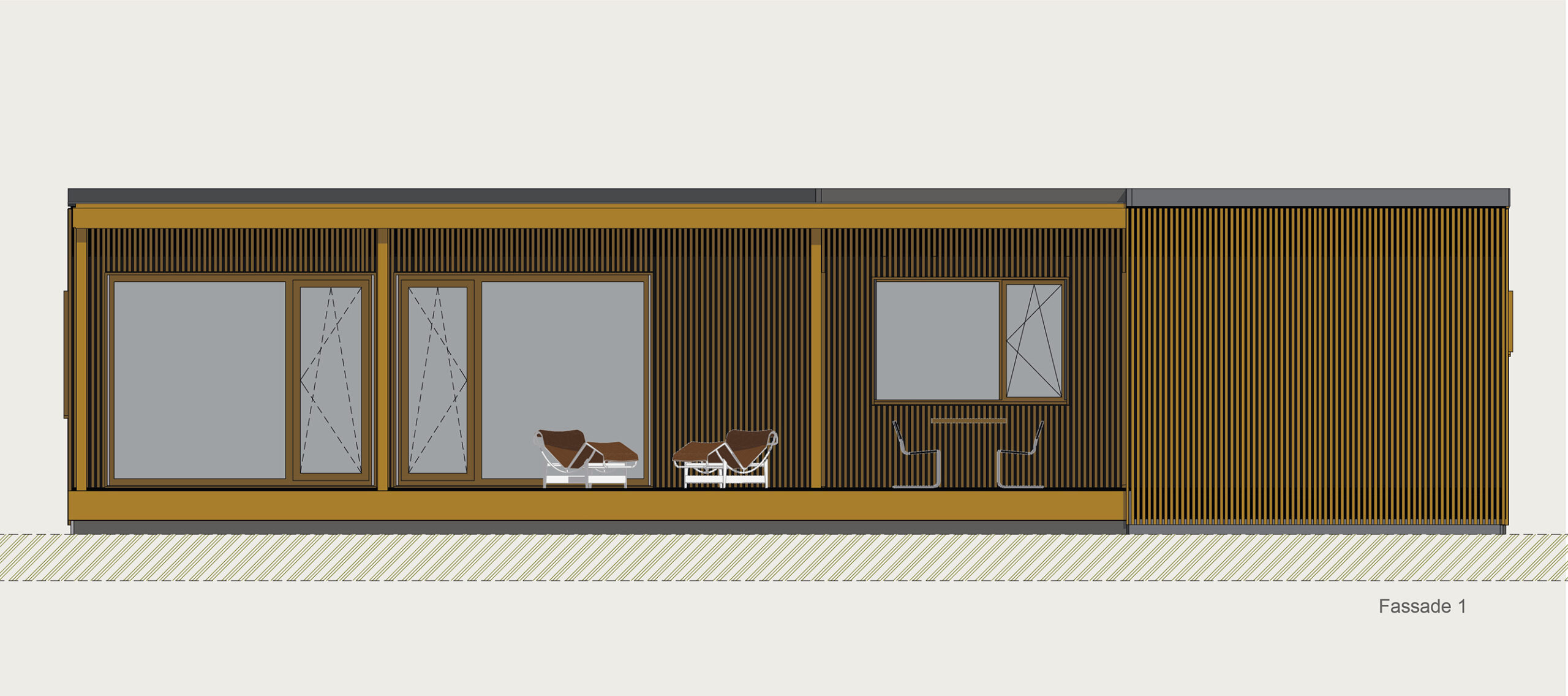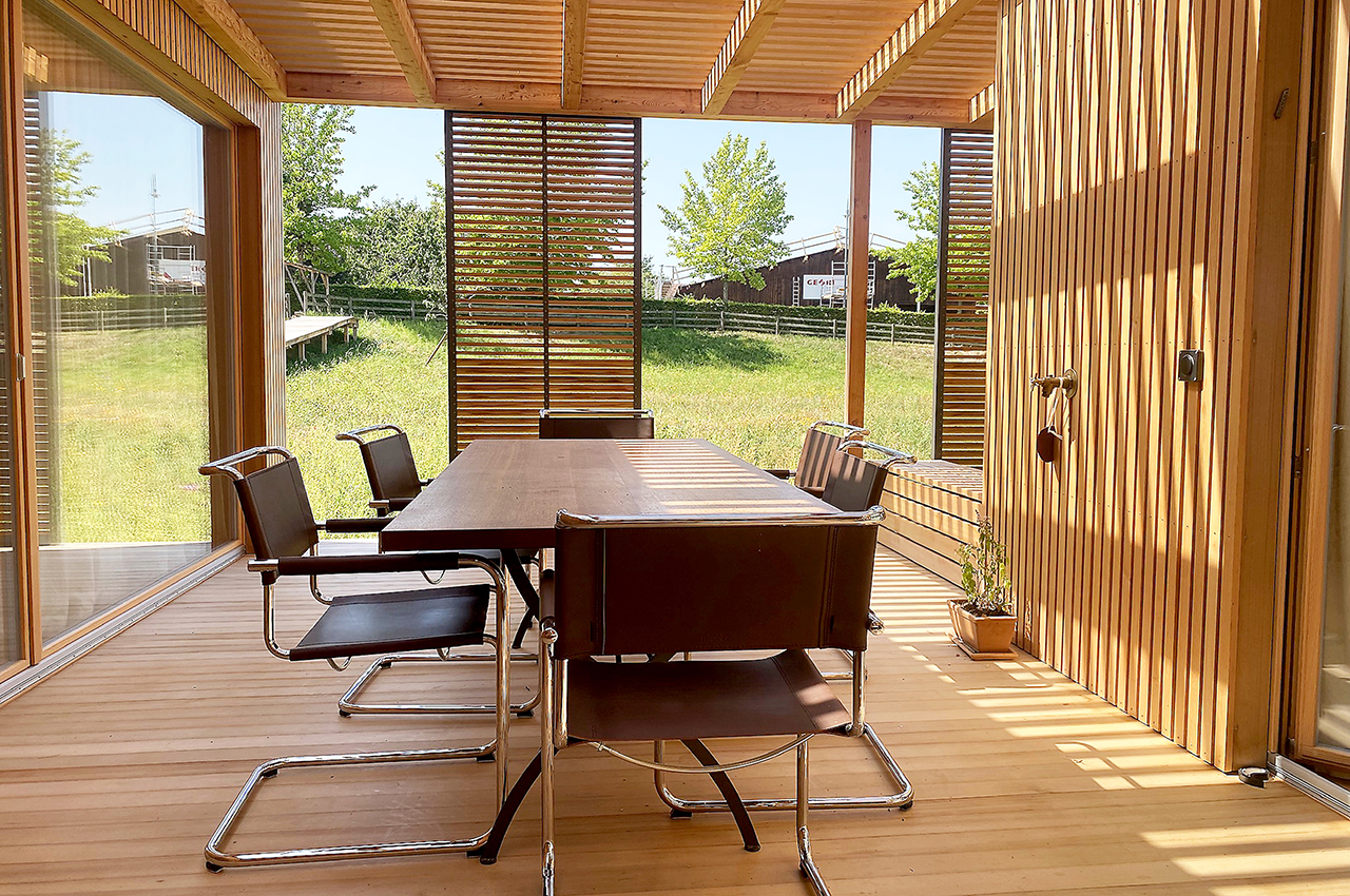 Die Kubusfassade besticht vor allem in der Präzision, welche durch die offene vertikale Holzschalung in ihrer Feinheit und den Farbnuancen zum Tragen kommt. In Kombination mit der transparenten Dachlattung gibt es während des Tagesablaufs wunderbare Muster, die diesem «Tiny House» eine subtile Inszenierung verleiht. Die Fenster sind jeweils präzise eingesetzt, um das Optimum an Offenheit für den Innenbereich zu gewährleisten. Jedes Detail dieses Hauses zeigt eine durchdachte Ästhetik.