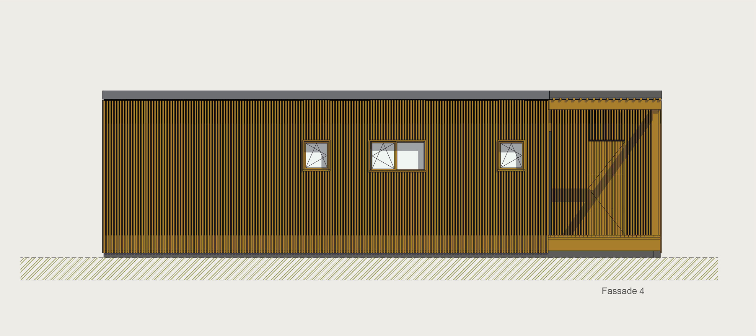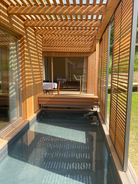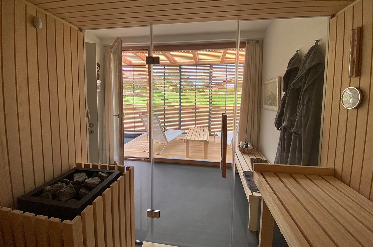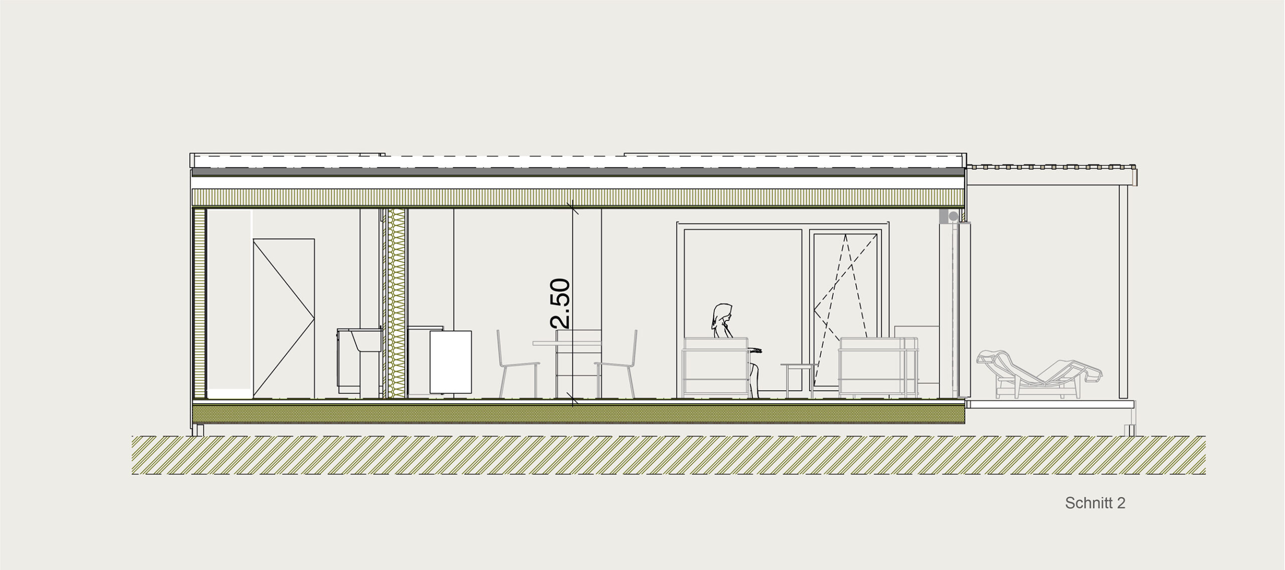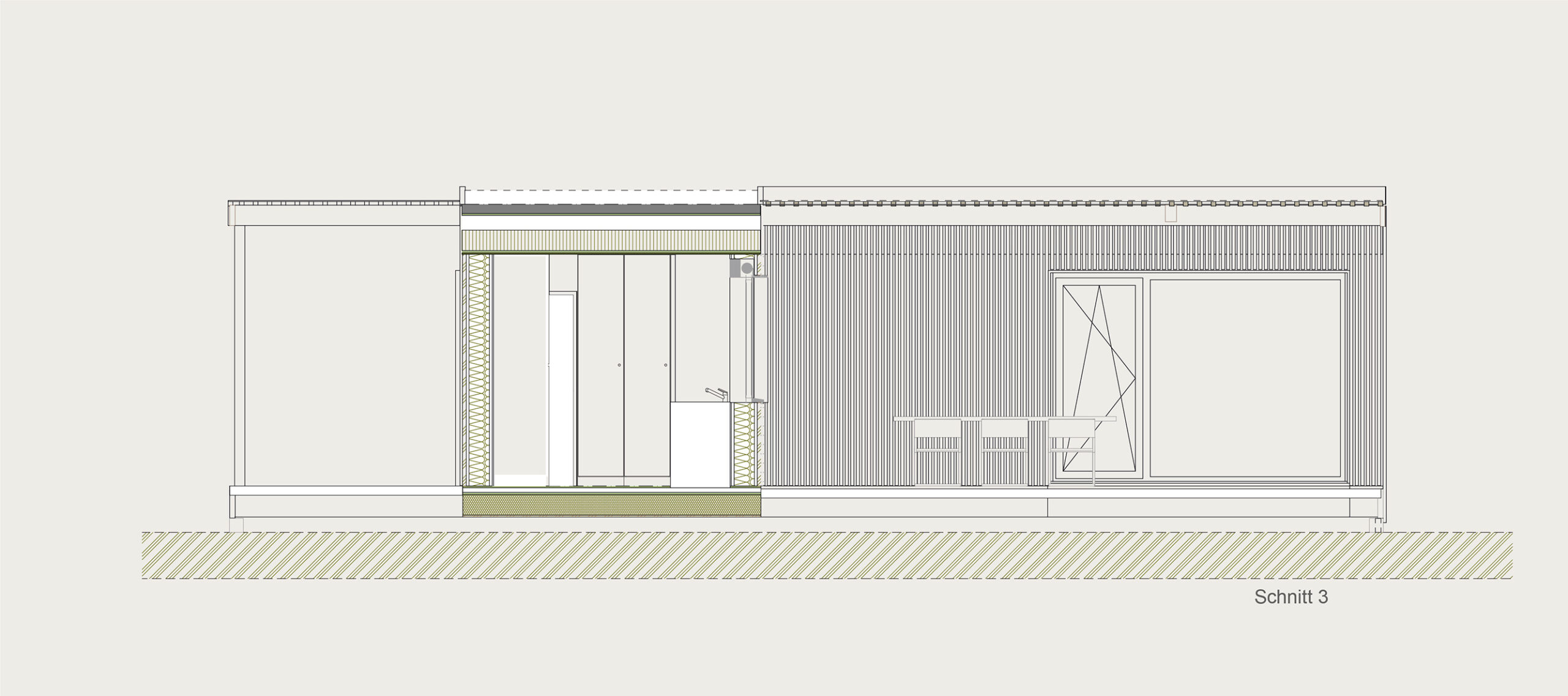 Die Kubusfassade besticht vor allem in der Präzision, welche durch die offene vertikale Holzschalung in ihrer Feinheit und den Farbnuancen zum Tragen kommt. In Kombination mit der transparenten Dachlattung gibt es während des Tagesablaufs wunderbare Muster, die diesem «Tiny House» eine subtile Inszenierung verleiht. Die Fenster sind jeweils präzise eingesetzt, um das Optimum an Offenheit für den Innenbereich zu gewährleisten. Jedes Detail dieses Hauses zeigt eine durchdachte Ästhetik.