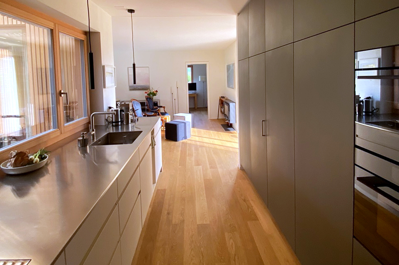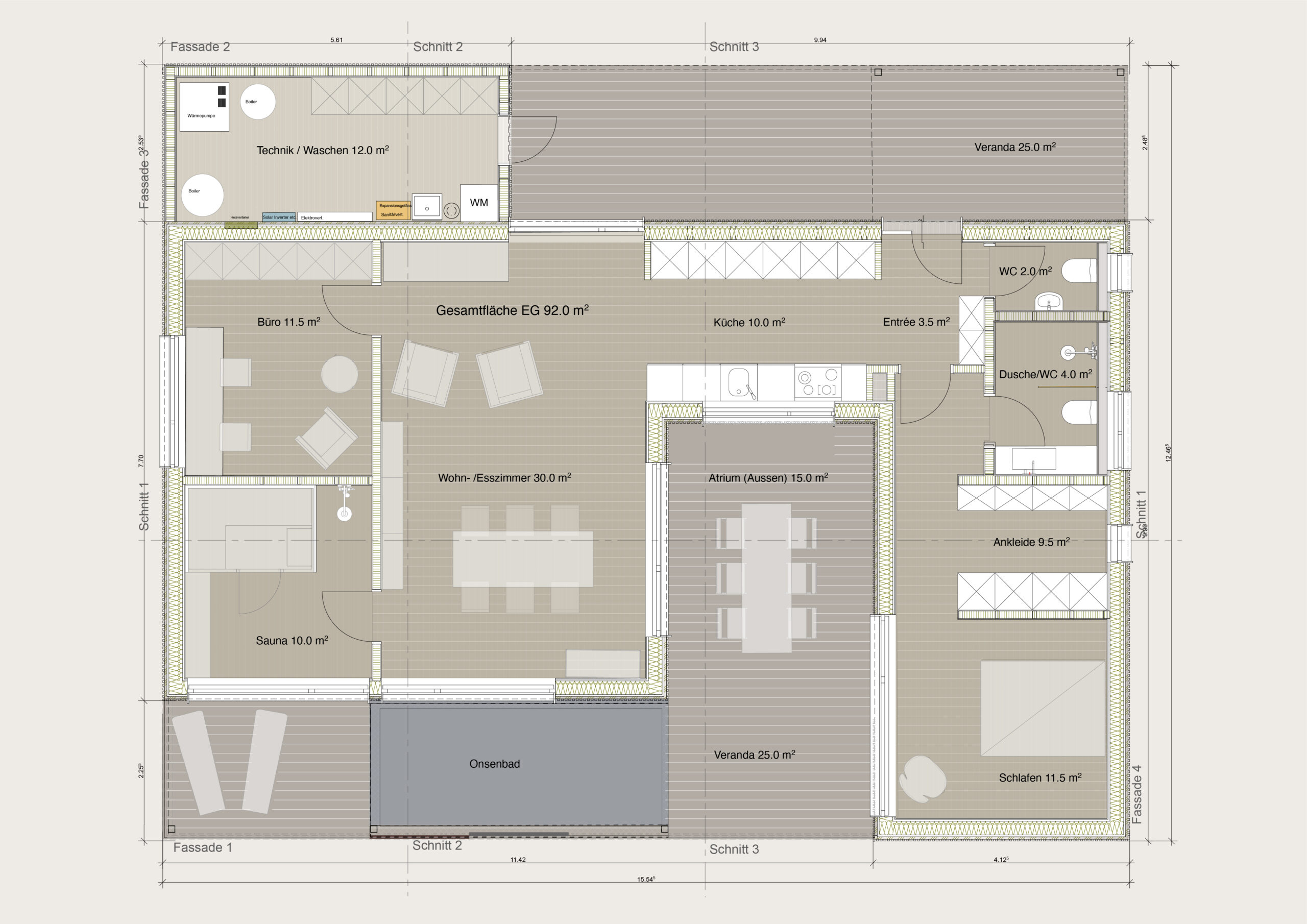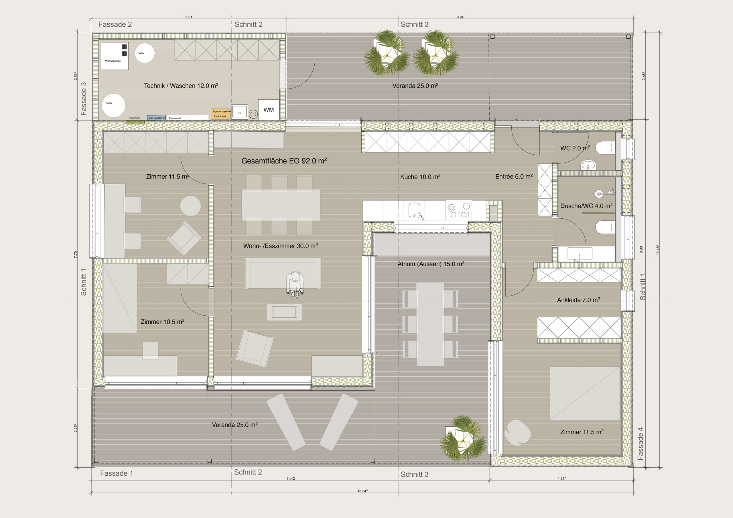Der Atriumkubus ist ideal für 2 bis 4 Personen, welche trotz minimaler Fläche nicht auf Qualität und gutes Design verzichten möchten. Auch mit einer Grundfläche von insgesamt 92 m2 (ohne Atrium) hat der Kubus alles, was man sich wünscht.