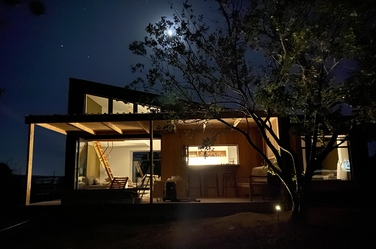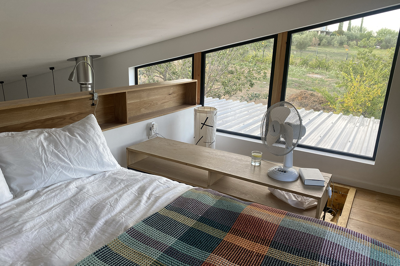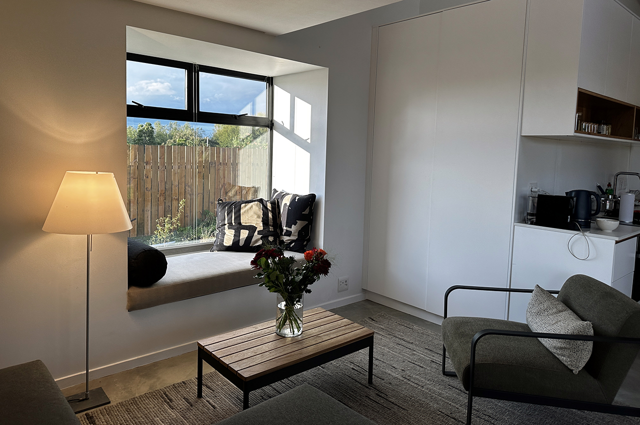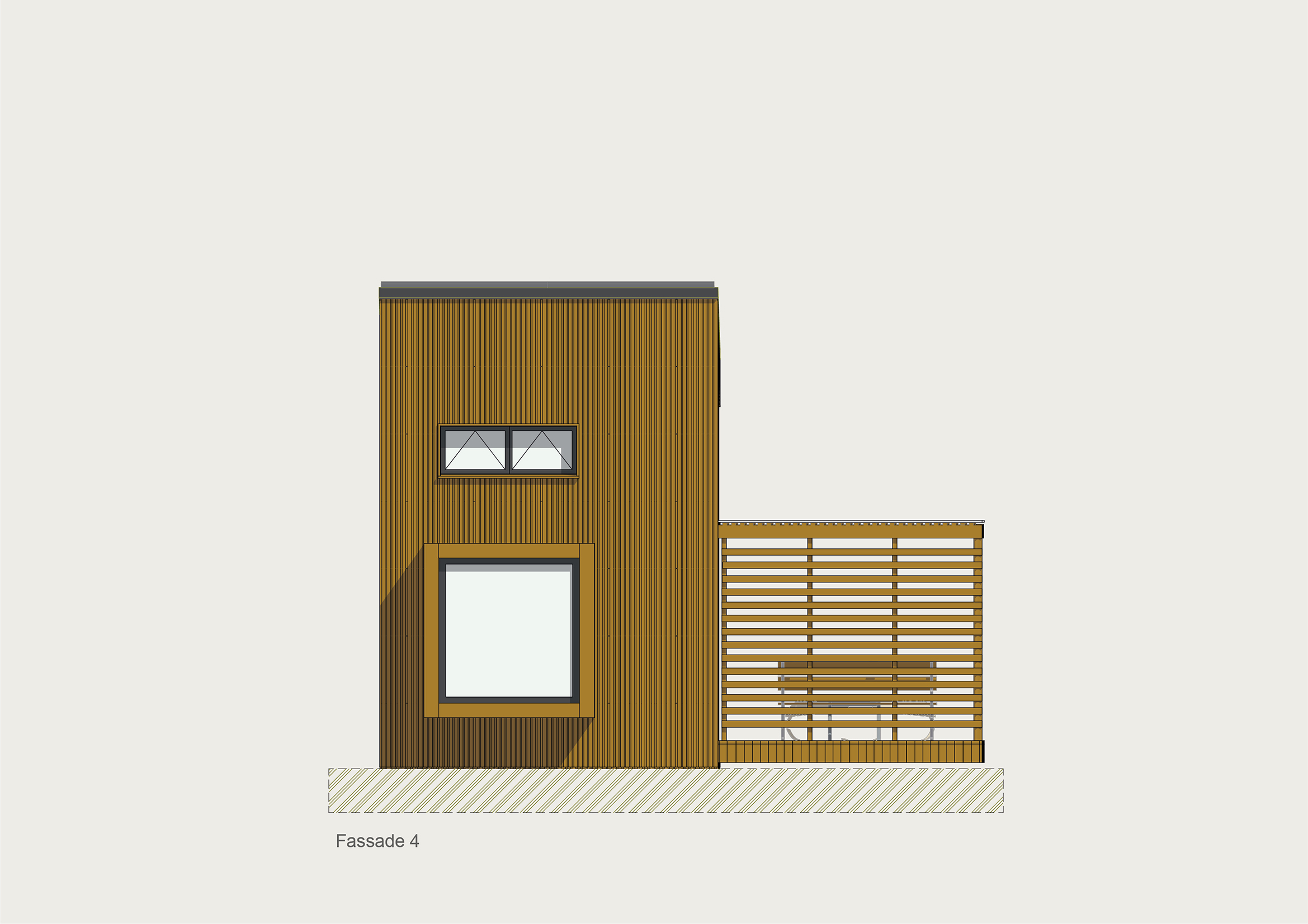 Die Kubusfassade besticht vor allem in der Präzision, welche durch die offene vertikale Holzschalung in ihrer Feinheit und den Farbnuancen zum Tragen kommt. in Kombination mit der transparenten Dachlattung gibt es während dem Tagesablauf wunderbare Muster, die diesem «Tiny House» eine subtile Inszenierung verleiht. Die Fenster sind jeweils präzise eingesetzt um das Optimum an Offenheit für den Innenbereich zu gewährleisten. Jedes Detail dieses Hauses zeigt eine durchdachte Ästhetik.