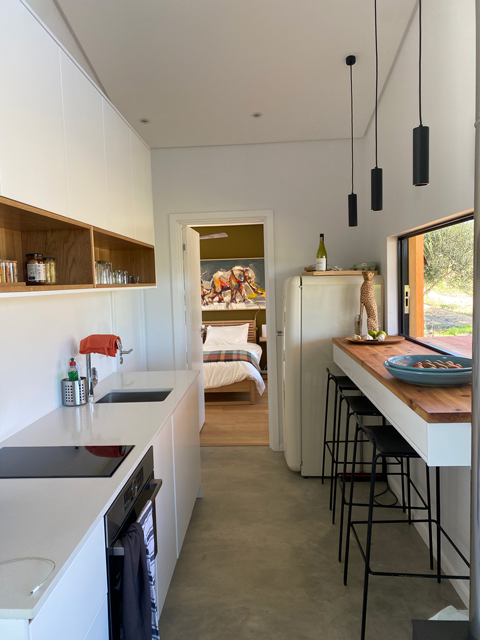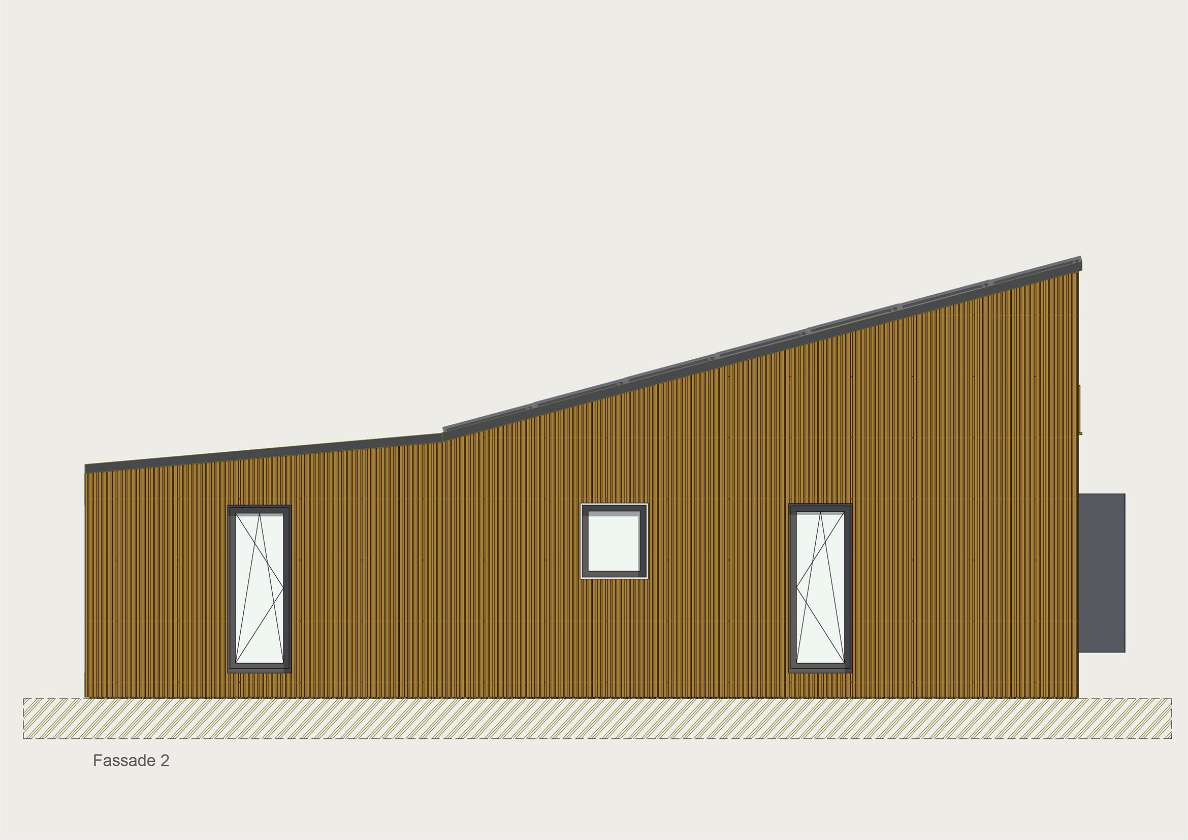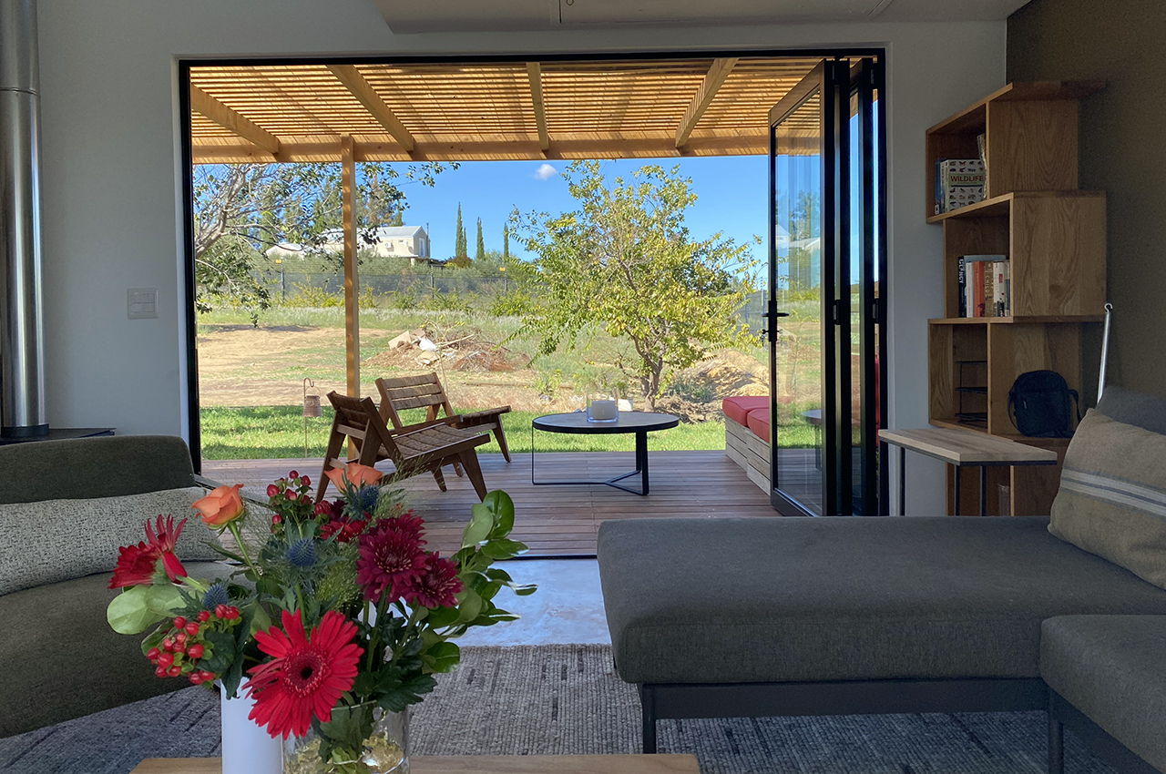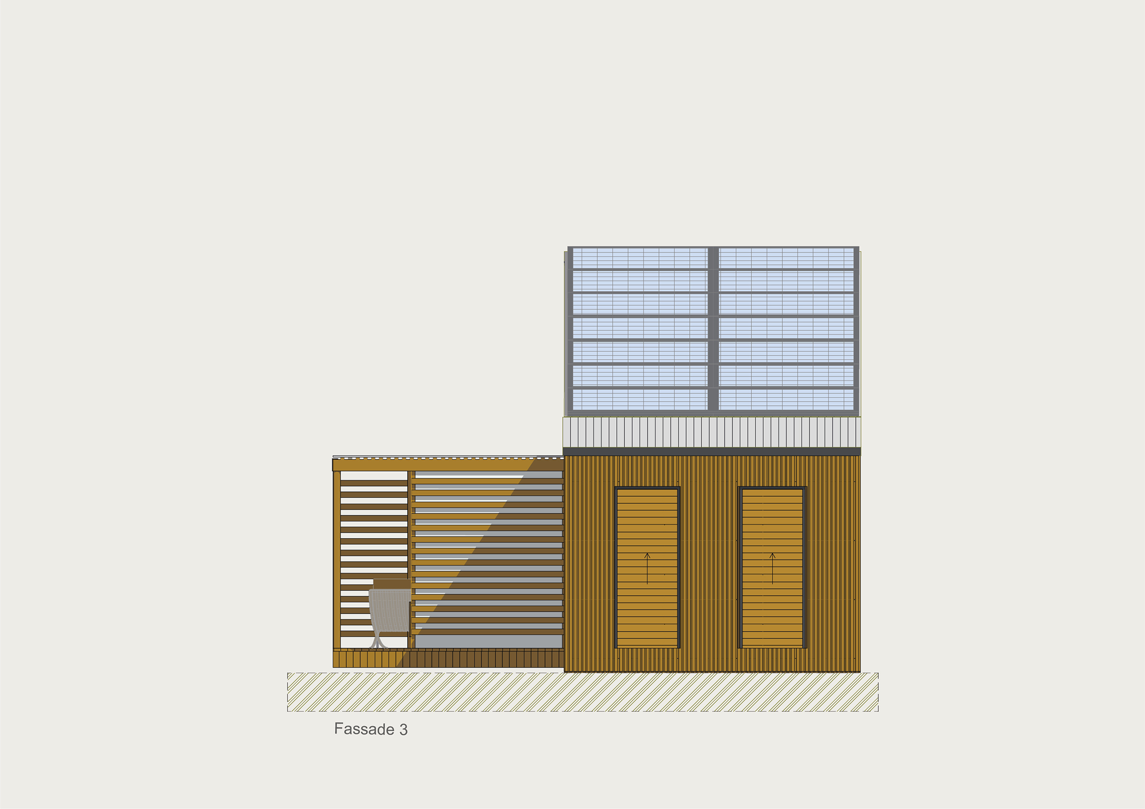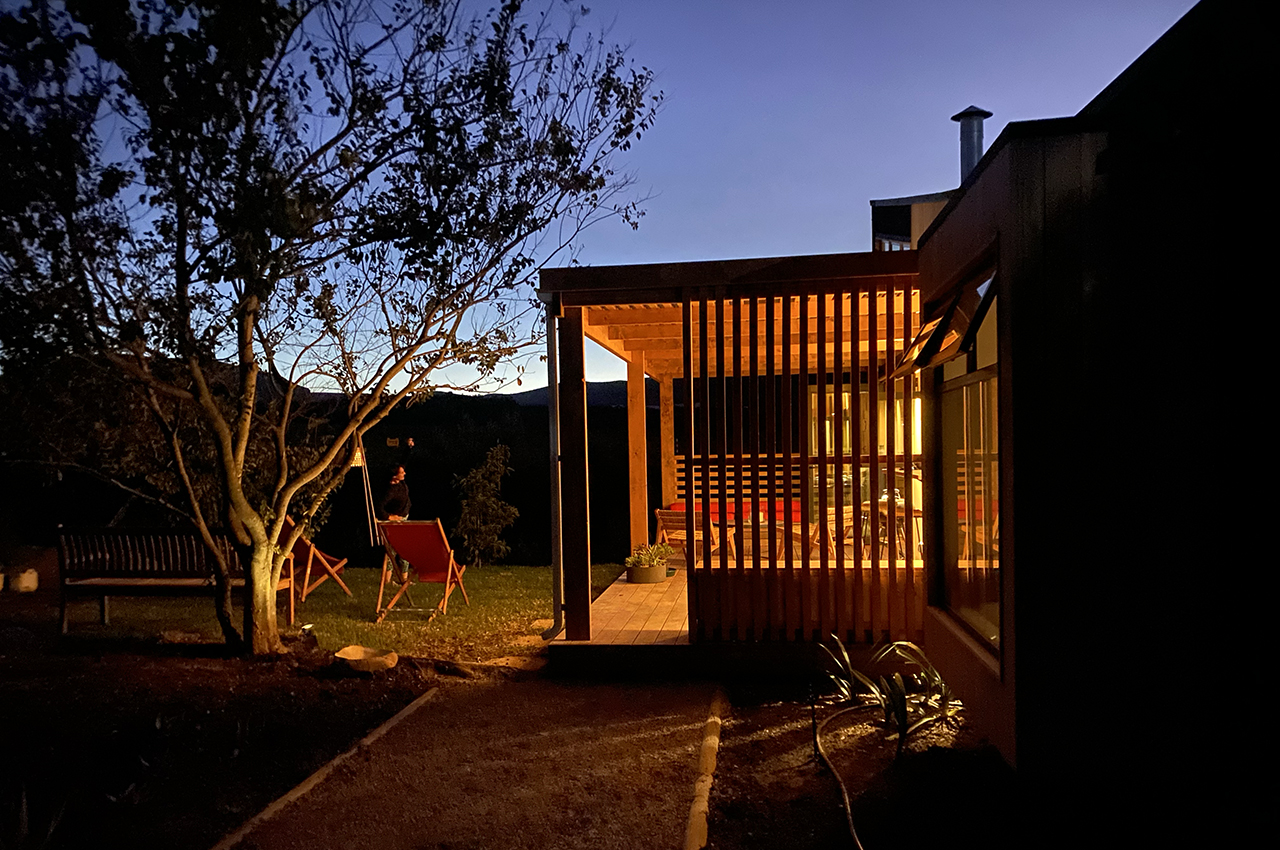 Die Kubusfassade besticht vor allem in der Präzision, welche durch die offene vertikale Holzschalung in ihrer Feinheit und den Farbnuancen zum Tragen kommt. in Kombination mit der transparenten Dachlattung gibt es während dem Tagesablauf wunderbare Muster, die diesem «Tiny House» eine subtile Inszenierung verleiht. Die Fenster sind jeweils präzise eingesetzt um das Optimum an Offenheit für den Innenbereich zu gewährleisten. Jedes Detail dieses Hauses zeigt eine durchdachte Ästhetik.